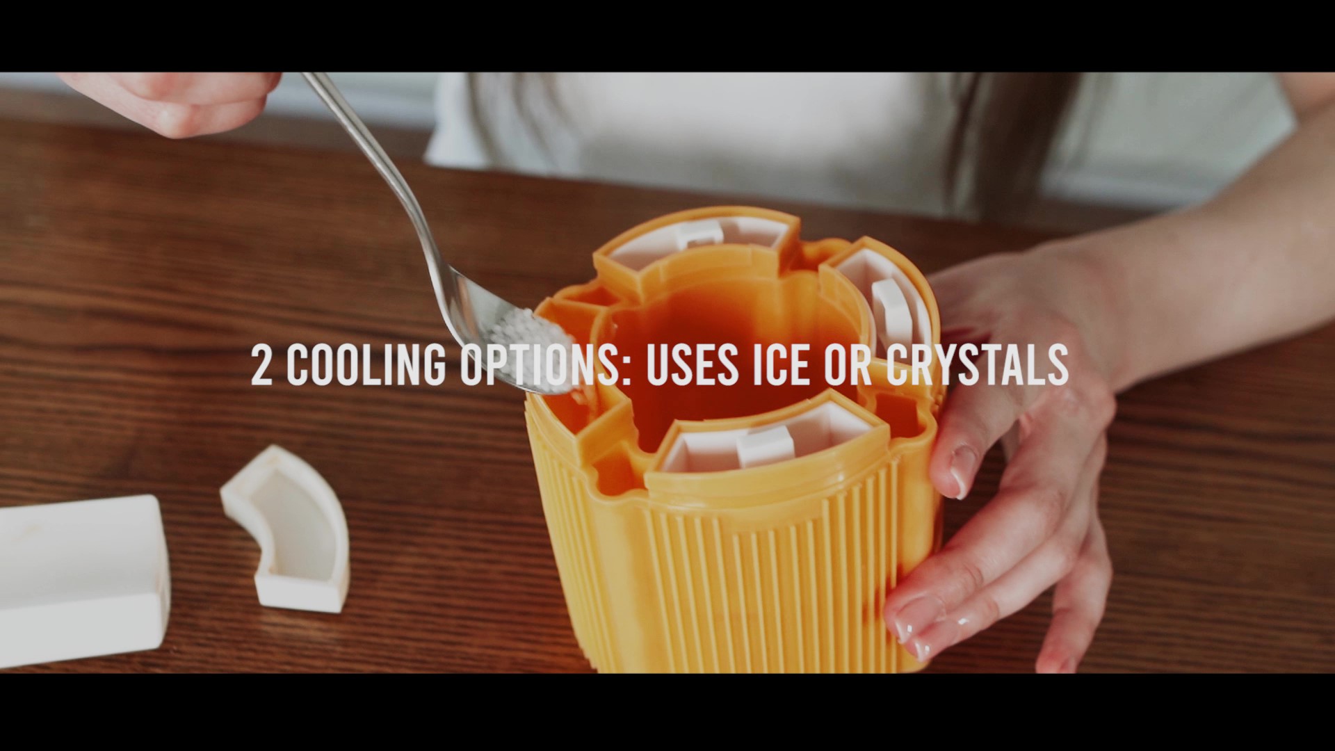 The Chill Sleeve can be pre-chilled using 2 options prior to being used to chill beverages in cans and bottles. The simplest and most effective way is by filling the body compartments with water and freezing in a refrigerator. Another method that can be employed is by adding crystals (urea pellets - not included in product packaging) in the crystal bins held in the body compartment. When these crystals are mixed with cold water, cooling occurs.